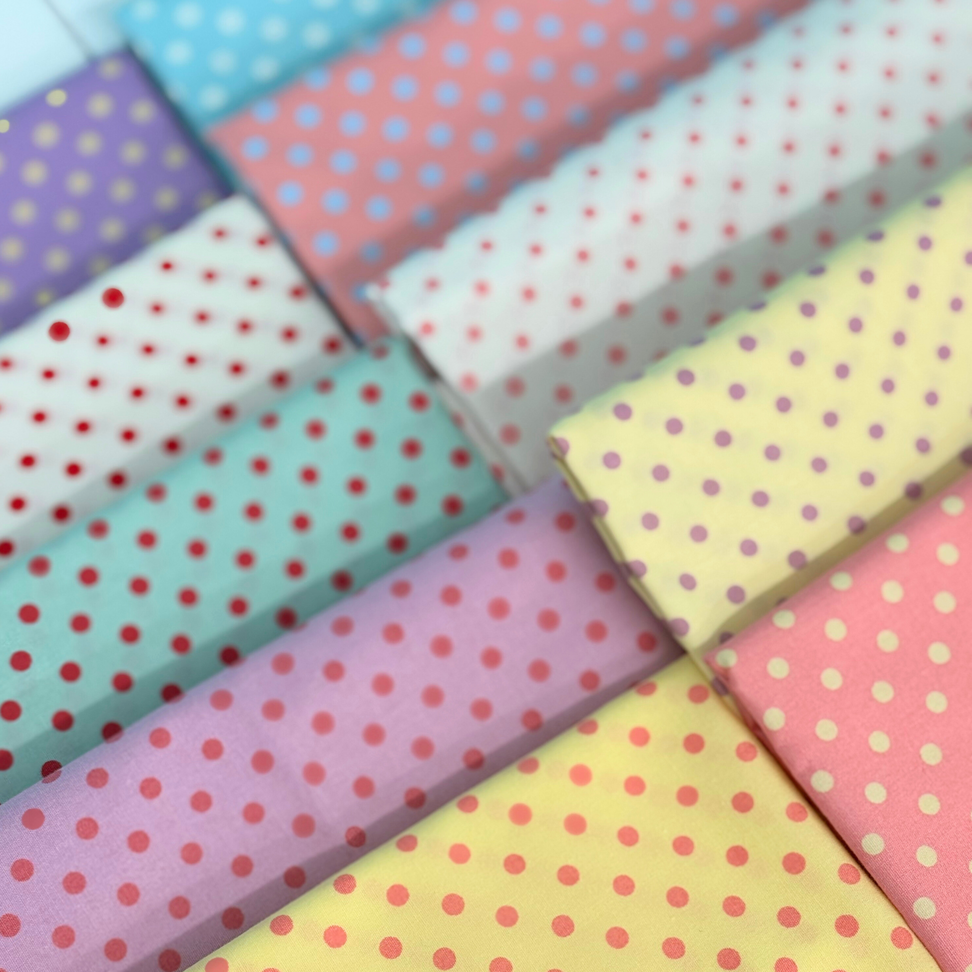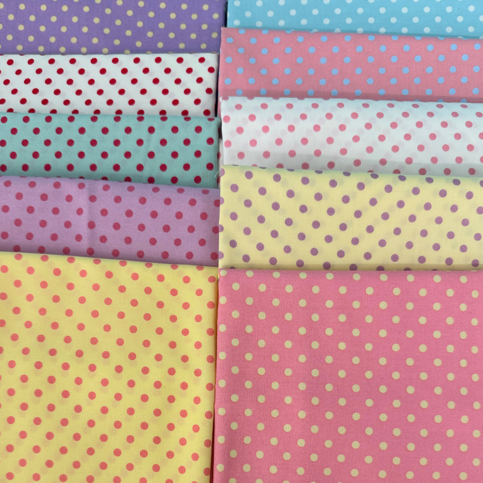Bundle of 10 Fat Quarters of fantastic quality quilting cotton fabric in 10 different polka dot colourways.